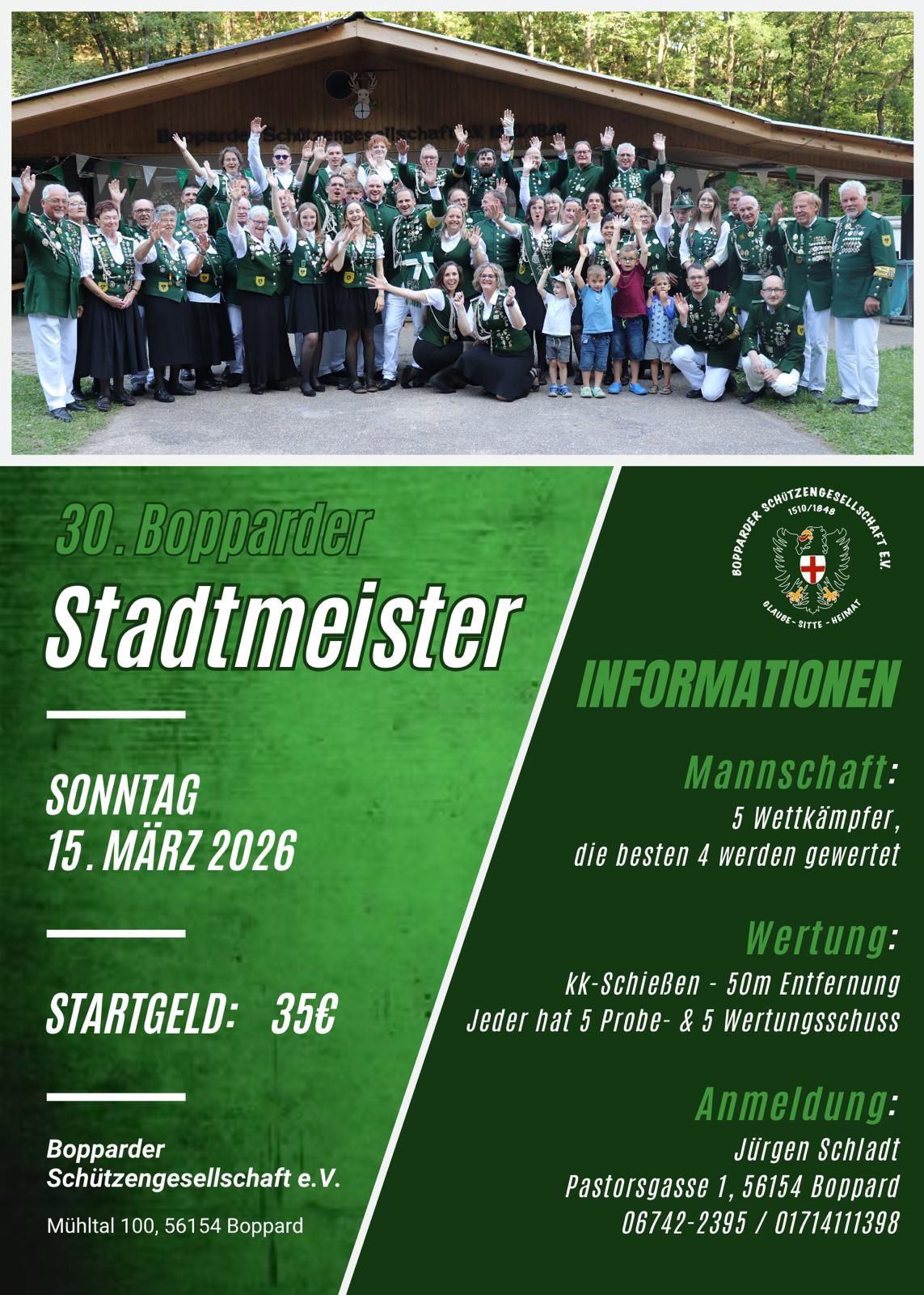 12 März 30. Bopparder Mannschafts-Stadtmeisterschaft im KK-Schießen Posted at 09:31h in Aktuelles by Jürgen Ströhl Bopparder Schützengesellschaft lädt Mannschaften aller Ortsteile ein